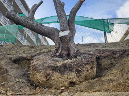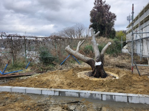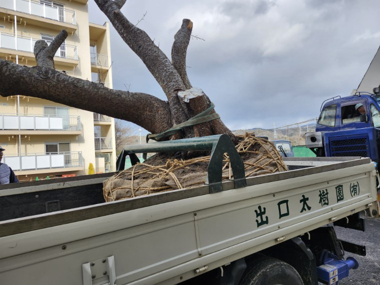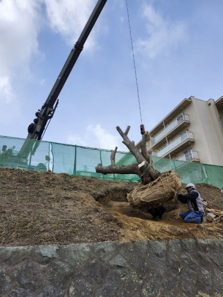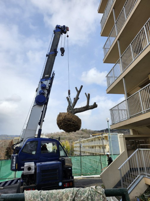 神戸市北区で 思い出の桜移植作業の依頼 大型クレーンでの移植 無事作業終了 また 綺麗な花を咲いてくれる時が楽しみです。 ありがとうございました。